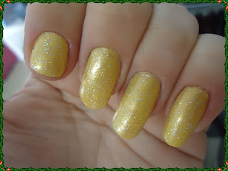 3-Sobre a cor utilizada, fiz uma combinação com esmaltes da Mohda, por baixo duas camadas de Shortinho(coleção de Verão)!!!Gente como é chato de passar esmalte amarelo , mas ainda assim eu sou brasileira e não desisto nunca,e pra dar o toque Natalino, usei o Topázio tb da Mohda,da coleção Luzes Holográficas!!Pra dar mais um UP e deixar mais Elke Maravilha eu passei o intensificador Holografico da mesma linha!!!